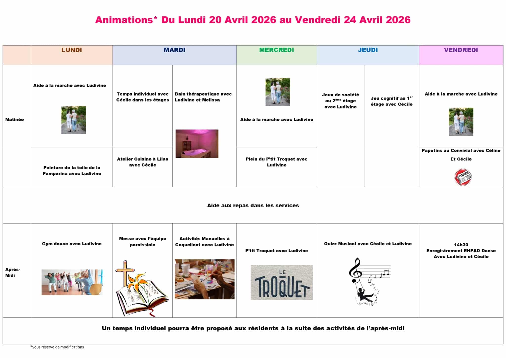 - Afin de préserver les capacités cognitives des personnes accueillies, un service d’activités en journée à visée thérapeutique, est proposé